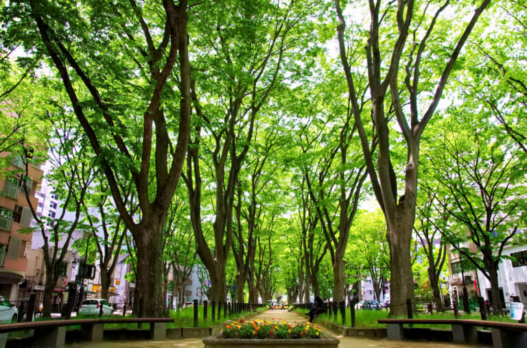 Jozenji-dori is a tree-lined avenue running east–west through the center of Sendai. It is named after Jozenji Temple, which was built during the same period that Date Masamune (1567–1636), the powerful warlord and daimyo, built Aoba Castle and founded the town of Sendai in the early seventeenth century. Although Jozenji Temple no longer exists, Jozenji-dori calls to mind the early history of the city, and its greenery continues Sendai’s legacy as the City of Trees.