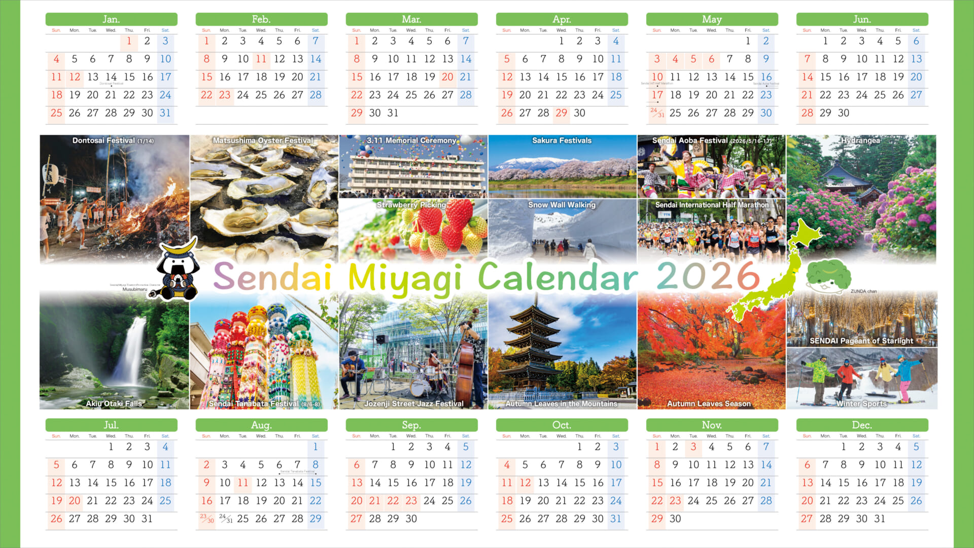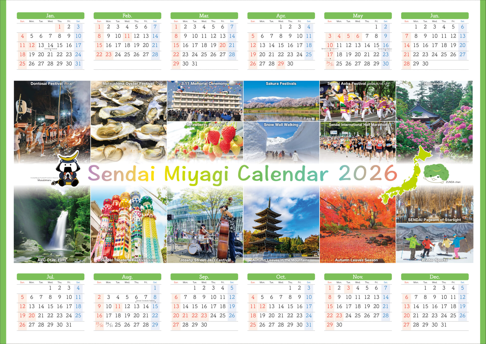 A calendar highlighting Japanese public holidays and events in Sendai is available for download.