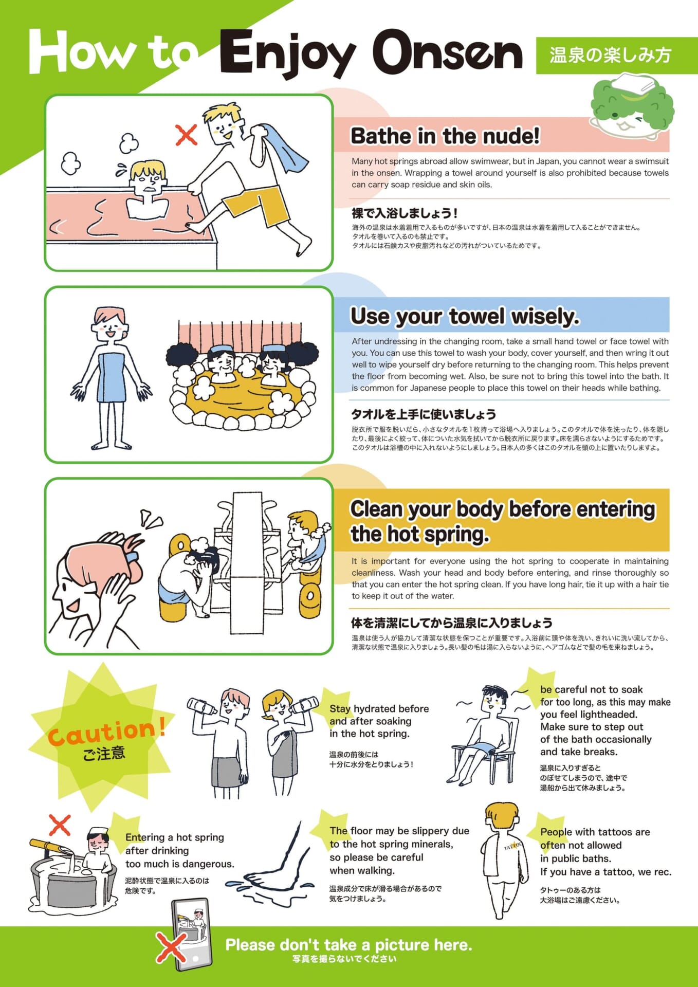 When you go to an onsen or a public bathhouse, you should first take off your clothes in the changing room and then enter the bathing area. Since everyone will enter the same large bath, you should first wash yourself before entering the bath. You should not take a towel into the bath nor drain the water.